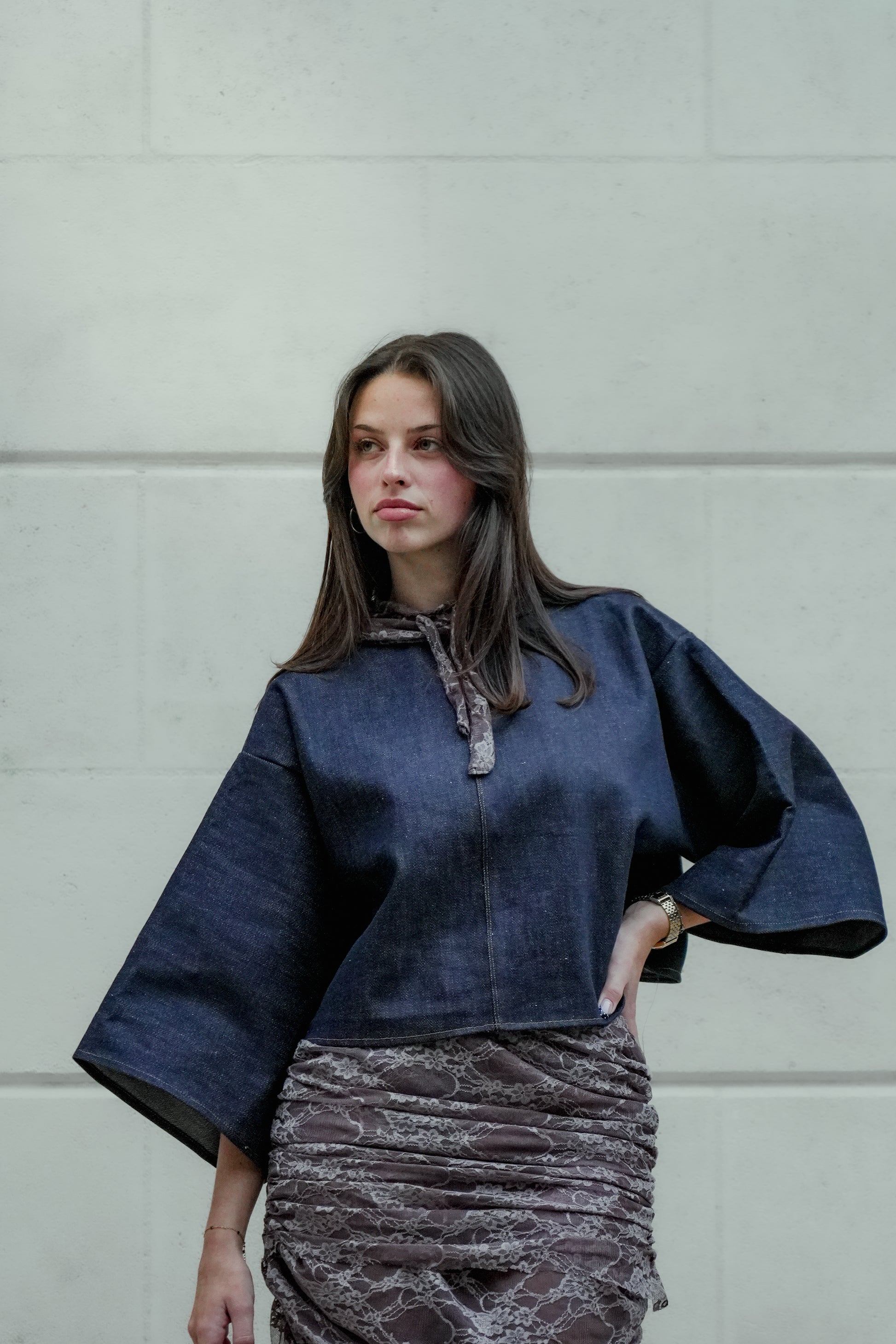 Réinventez le denim avec ce haut au design contemporain et épuré. Confectionné dans une toile de jean bleu brut, il séduit par sa coupe boxy et ses manches trois-quarts amples, qui apportent volume et modernité à la silhouette.