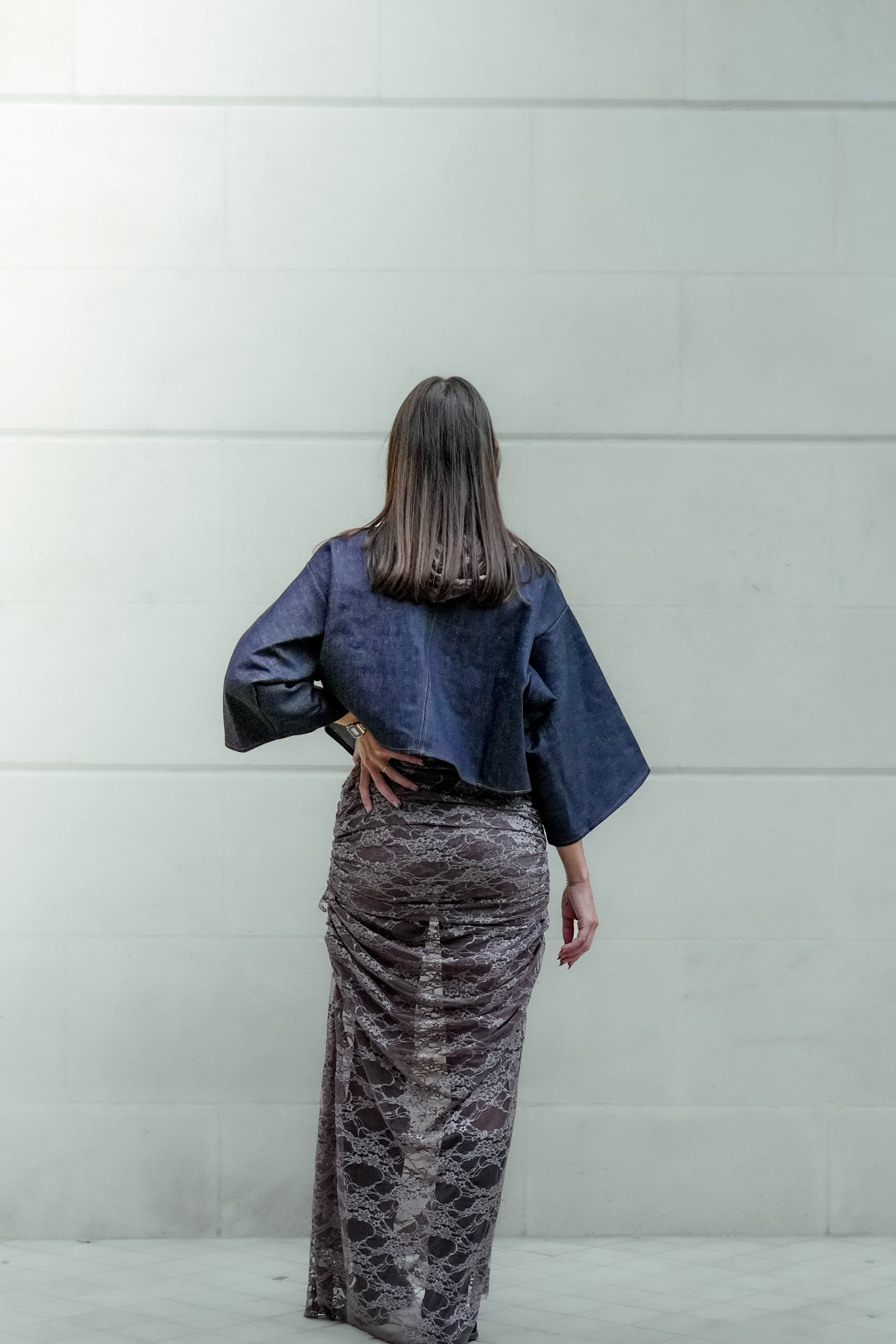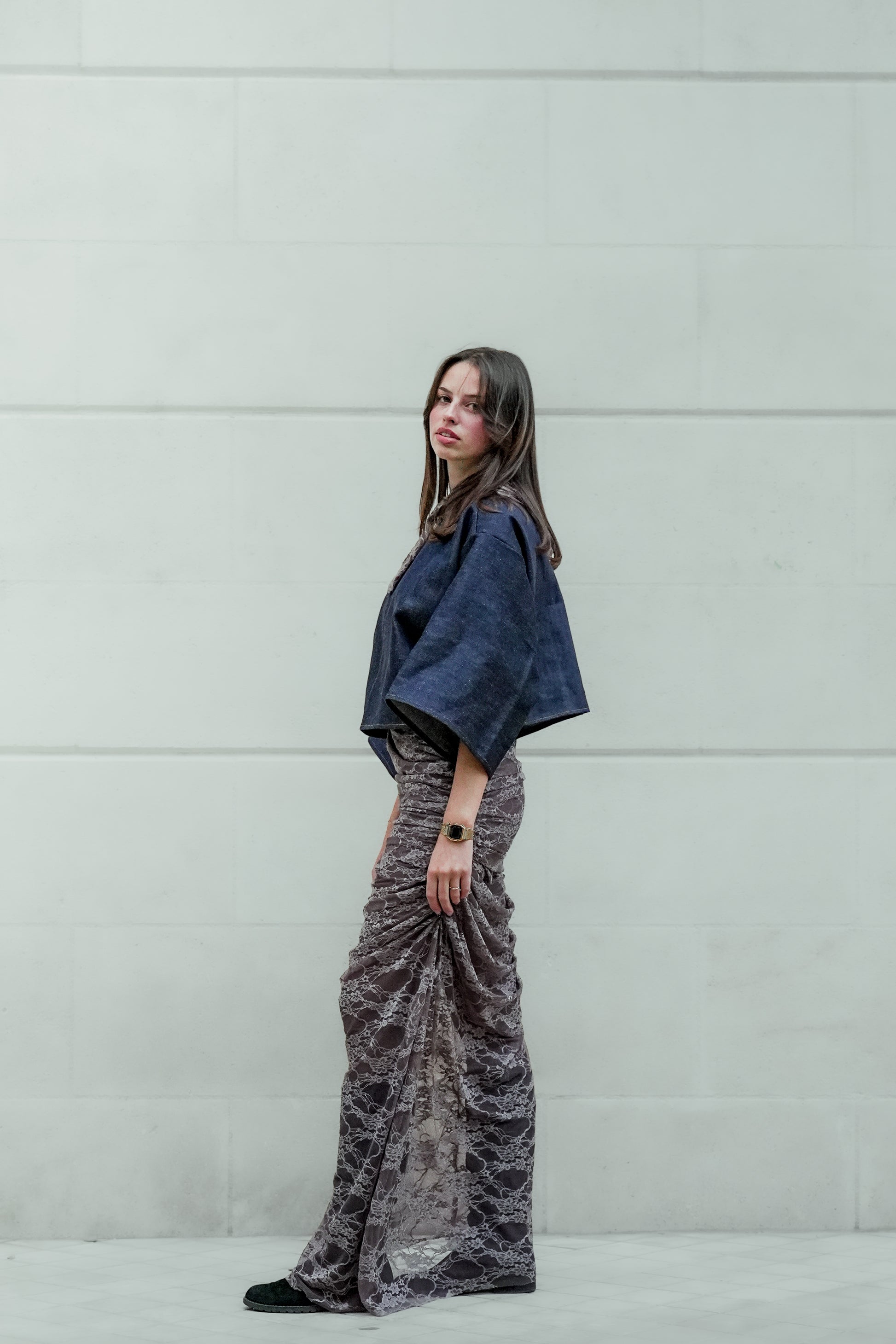 Jupe longue en dentelle drapée, coupe ajustée avec effet plissé sur toute la hauteur. Finition élégante et silhouette allongée