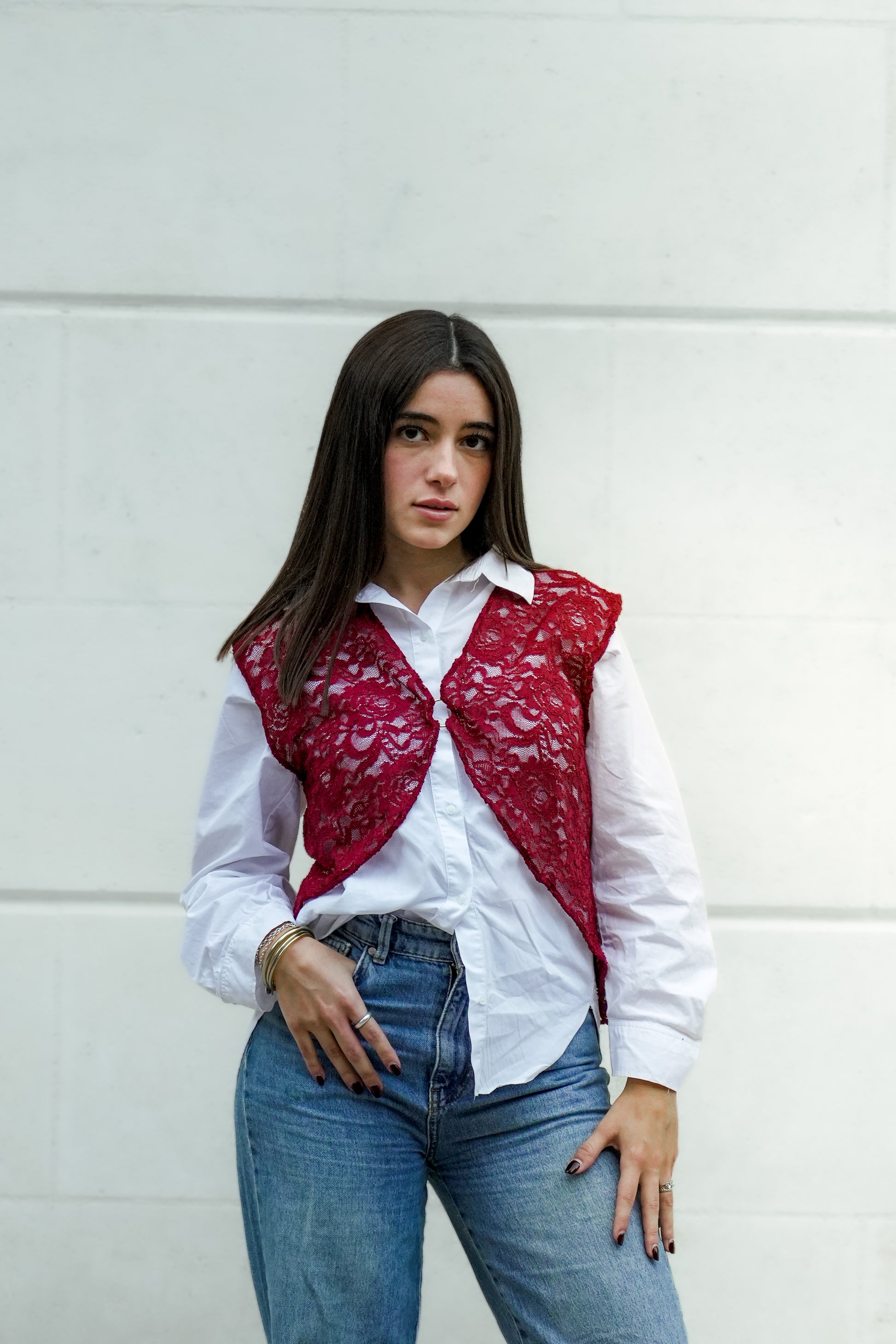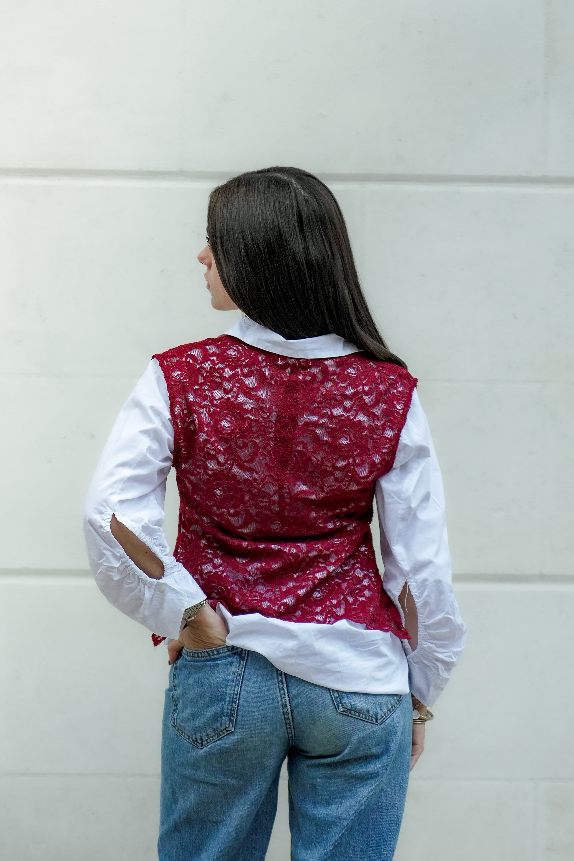La sur-chemise en dentelle réinvente la dentelle avec caractère. Confectionnée à la main dans une dentelle bordeaux profonde, elle se porte aussi bien sur une chemise blanche pour un contraste élégant que sur un top léger pour un look plus décontracté.